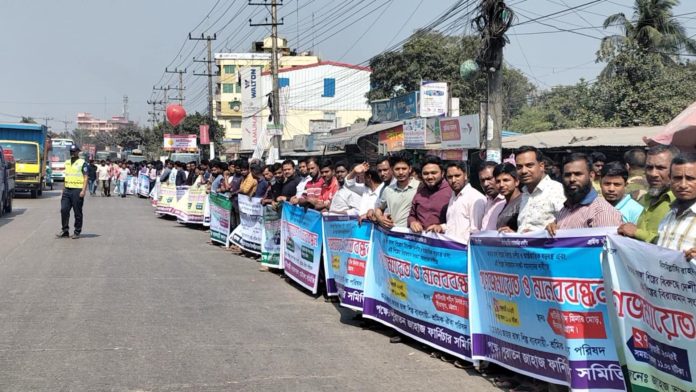 সকাল সাড়ে ১০টা থেকে দুপুর ১টা পর্যন্ত দীর্ঘ ১ঘন্টার মানববন্ধনে হাজারো ব্যবসায়ী, শ্রমিক-কর্মচারী অংশ নেয়। এক কিলোমিটার দীর্ঘ মানববন্ধন শেষে ভাটিয়ারী শহীদ মিনারের সামনে এক প্রতিবাদ সমাবেশ অনুষ্ঠিত হয়।