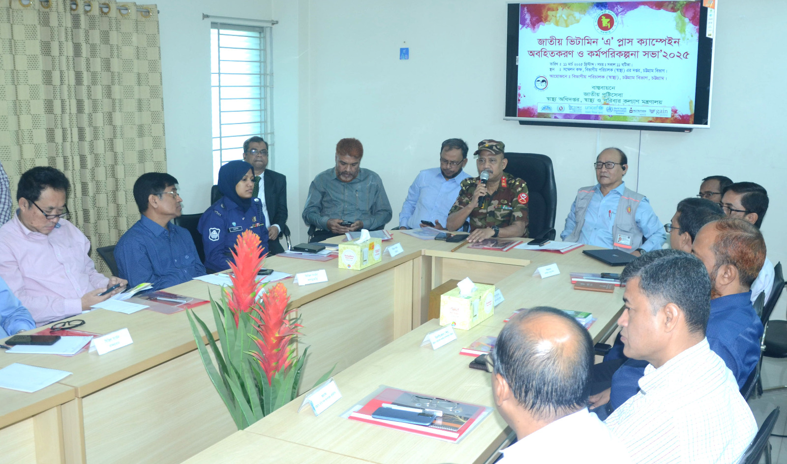 জাতীয় ভিটামিন ‘এ’ প্লাস ক্যাম্পেইন উপলক্ষে আজ ১১ মার্চ মঙ্গলবার সকালে নগরীর সিনেমা প্যালেস সংলগ্ন রয়েল রোডস্থ চট্টগ্রাম বিভাগীয় পরিচালক (স্বাস্থ্য) কার্যালয়ের সম্মেলন কক্ষে অনুষ্টিত অবহিতকরণ ও কর্মপরিকল্পনা সভায় প্রধান অতিথির বক্তব্যে তিনি এসব কথা বলেন। স্বাস্থ্য ও পরিবার কল্যাণ মন্ত্রনালয়ের আওতাধীন স্বাস্থ্য অধিদপ্তরের জনস্বাস্থ্য পুষ্টি প্রতিষ্টান ও জাতীয় পুষ্টি সেবার বাস্তবায়নে বিভাগীয় পরিচালক (স্বাস্থ্য) কার্যালয় সভার আয়োজন করেন।