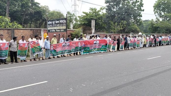 আজ বুধবার দুপুরে শ্রমিক নেতা মোঃ রবিউল হকের সভাপতিত্বে অনুষ্ঠিত মানববন্ধনে প্রধান অতিথি হিসেবে উপস্থিত ছিলেন, চট্টগ্রাম বিভাগীয় পাট শ্রমিকদলের সভাপতি এ এম নাজিম উদ্দীন।