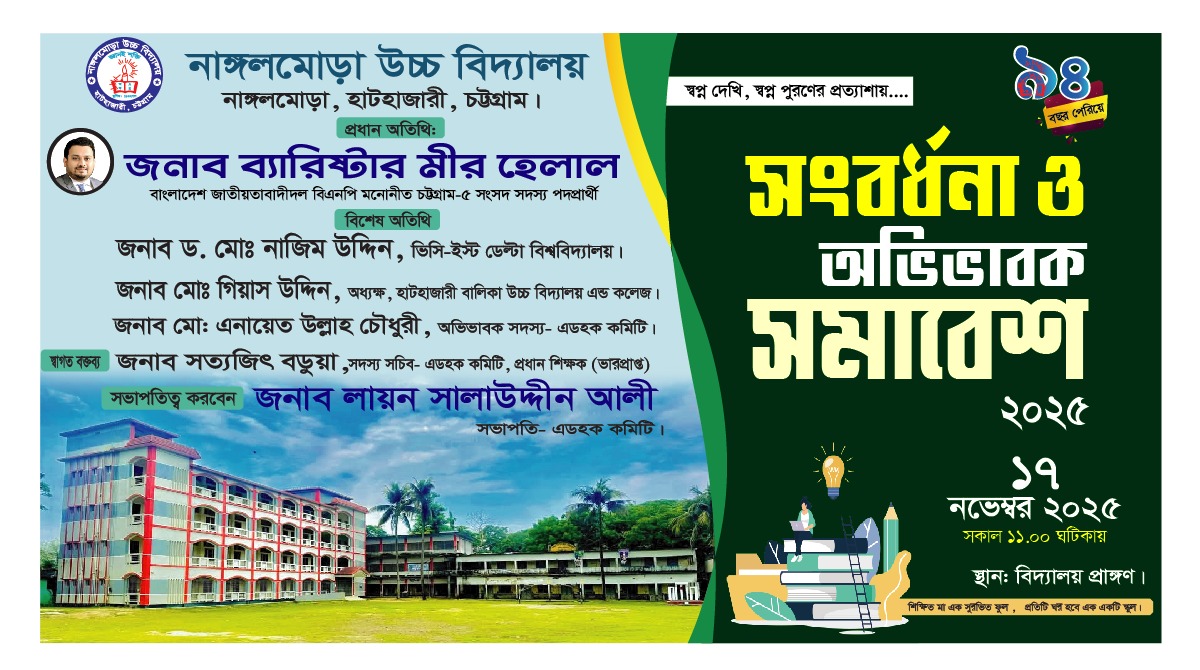চট্টগ্রামের হাটহাজারী উপজেলার নাঙ্গলমোড়া উচ্চ বিদ্যালয়ে আগামীকাল সোমবার (১৭ নভেম্বর ২০২৫) সকাল ১১টায় এক গুরুত্বপূর্ণ সংবর্ধনা ও অভিভাবক সমাবেশ অনুষ্ঠিত হতে যাচ্ছে। বিদ্যালয়ের পরিচালনা পরিষদের উদ্যোগে আয়োজিত এ অনুষ্ঠানে অংশগ্রহণ করবেন এলাকার বিশিষ্ট ব্যক্তিবর্গ, শিক্ষাবিদ, সমাজকর্মী, অভিভাবক এবং প্রাক্তন শিক্ষার্থীরা।