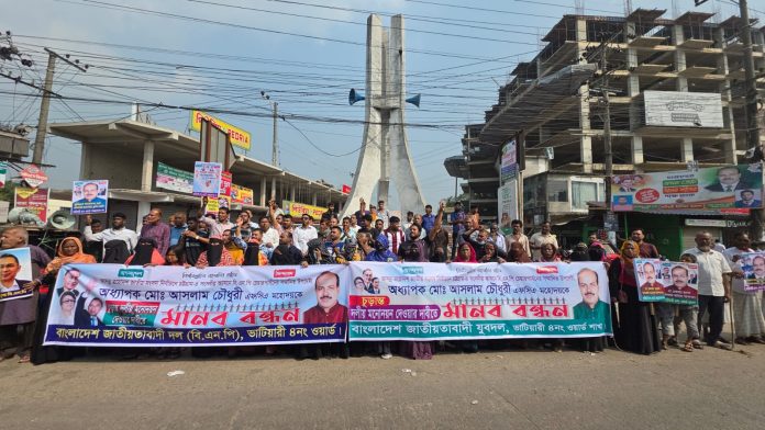 মানববন্ধন থেকে অভিলম্বে চট্টগ্রাম-৪ আসনে আসলাম চৌধুরীকে মনোনয়ন দেওয়ার দাবী জানানো হয়।