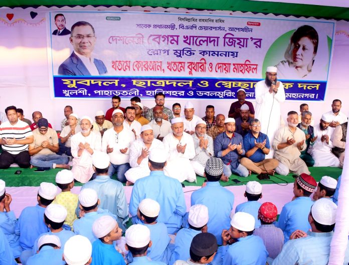 সাবেক প্রধানমন্ত্রী, বিএনপি চেয়ারপার্সন বেগম খালেদা জিয়ার রোগমুক্তি এবং দীর্ঘায়ু কামনায় বৃহস্পতিবার (৪ ডিসেম্বর) বিকালে জিইসি কনভেশন এর মাঠে জাতীয়তাবাদী যুবদল, স্বেচ্ছাসেবক দল ও ছাত্রদল খুলশী, ডবলমুরিং, পাহাড়তলী ও হালিশহর থানার যৌথ উদ্যোগে “পবিত্র কুরআন, বুখারী খতম ও দোয়া মাহফিলে প্রধান অতিথির বক্তব্যে এসব কথা বলেন।