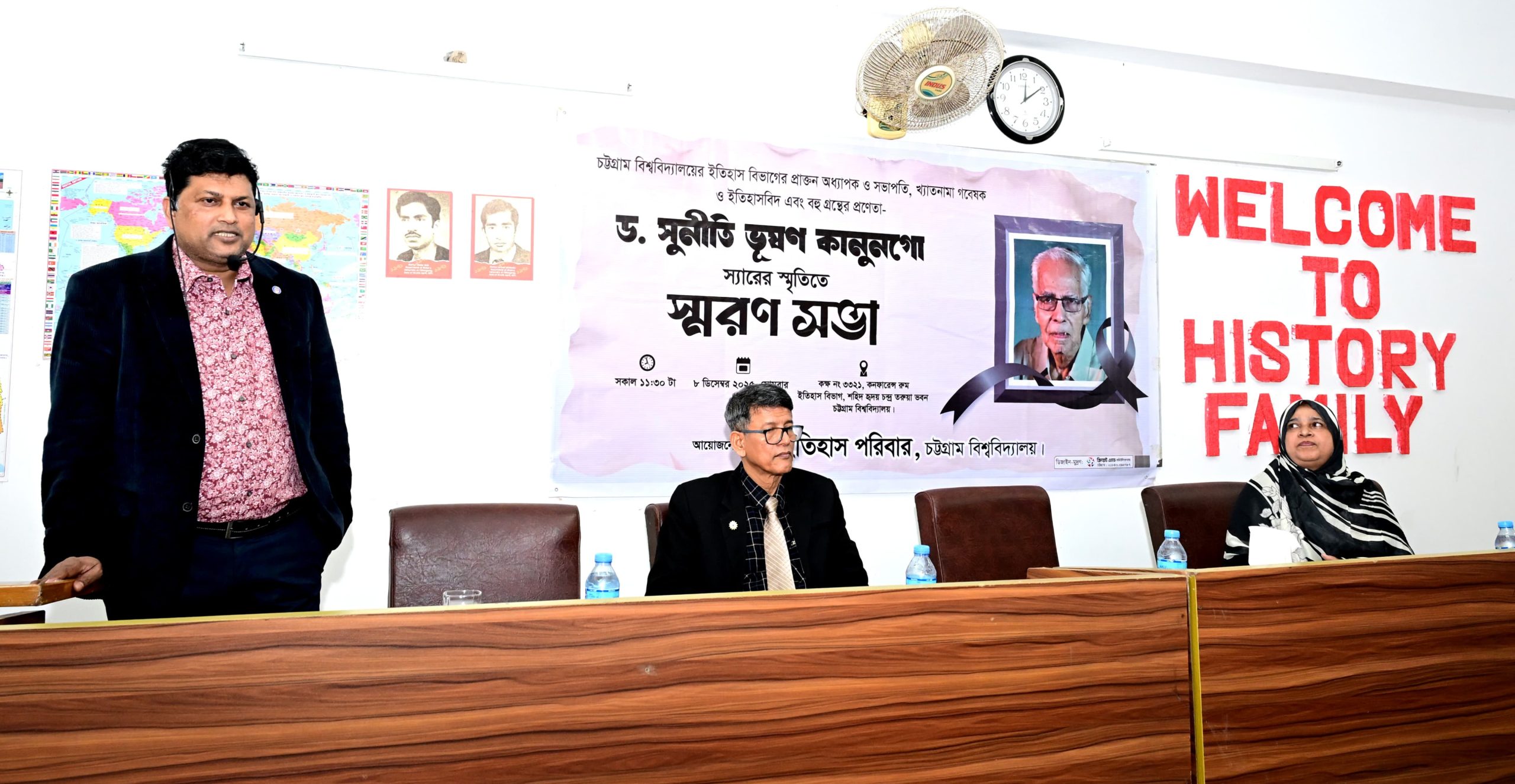 চট্টগ্রাম বিশ্ববিদ্যালয় ইতিহাস বিভাগের আয়োজনে চবি ইতিহাস বিভাগের অবসরপ্রাপ্ত প্রফেসর, খ্যাতমান গবেষক ও ইতিহাসবিদ এবং বহু গ্রন্থের প্রণেতা ড. সুনীতি ভূষণ কানুনগো এর স্মরণ সভা আজ সোমবার (০৮ ডিসেম্বর ২০২৫) বেলা ১১টায় চবি শহীদ হৃদয় চন্দ্র তড়ুয়া ভবনের ইতিহাস বিভাগের হল রুমে অনুষ্ঠিত হয়েছে।
