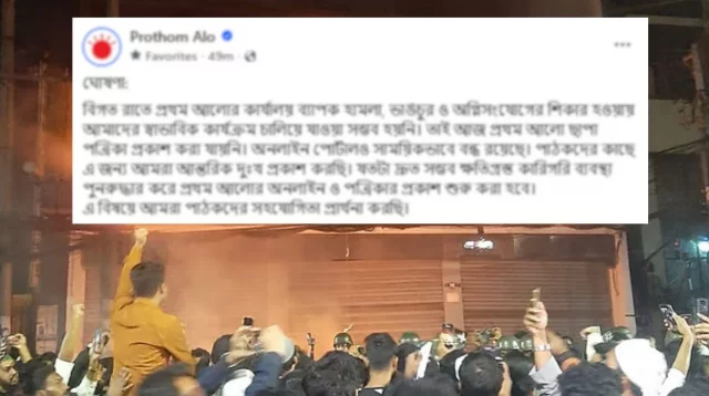 শুক্রবার (১৯ ডিসেম্বর) প্রথম আলো তাদের ওয়েবসাইট ও ফেসবুক পেজে লিখেছে, ‘বিগত রাতে প্রথম আলোর কার্যালয় ব্যাপক হামলা, ভাঙচুর ও অগ্নিসংযোগের শিকার হওয়ায় এর স্বাভাবিক কার্যক্রম চালিয়ে যাওয়া সম্ভব হয়নি। তাই আজ প্রথম আলো ছাপা পত্রিকা প্রকাশ করা যায়নি। এর অনলাইন পোর্টালও সাময়িকভাবে বন্ধ রয়েছে।’