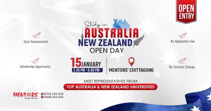 মেন্টরস চট্টগ্রামের উদ্যোগে শিক্ষার্থীদের আর্ন্তজাতিক উচ্চশিক্ষার স্বপ্নকে বাস্তবে রূপ দিতে অনুষ্ঠিত হতে যাচ্ছে ‘স্টাডি ইন অস্ট্রেলিয়া অ্যান্ড নিউজিল্যান্ড ওপেন ডে বৃহস্পতিবার (১৫ জানুয়ারি) মেন্টরস চট্টগ্রামে এই ব্যতিক্রমর্ধমী শিক্ষা মেলার আয়োজন করা হয়েছে।