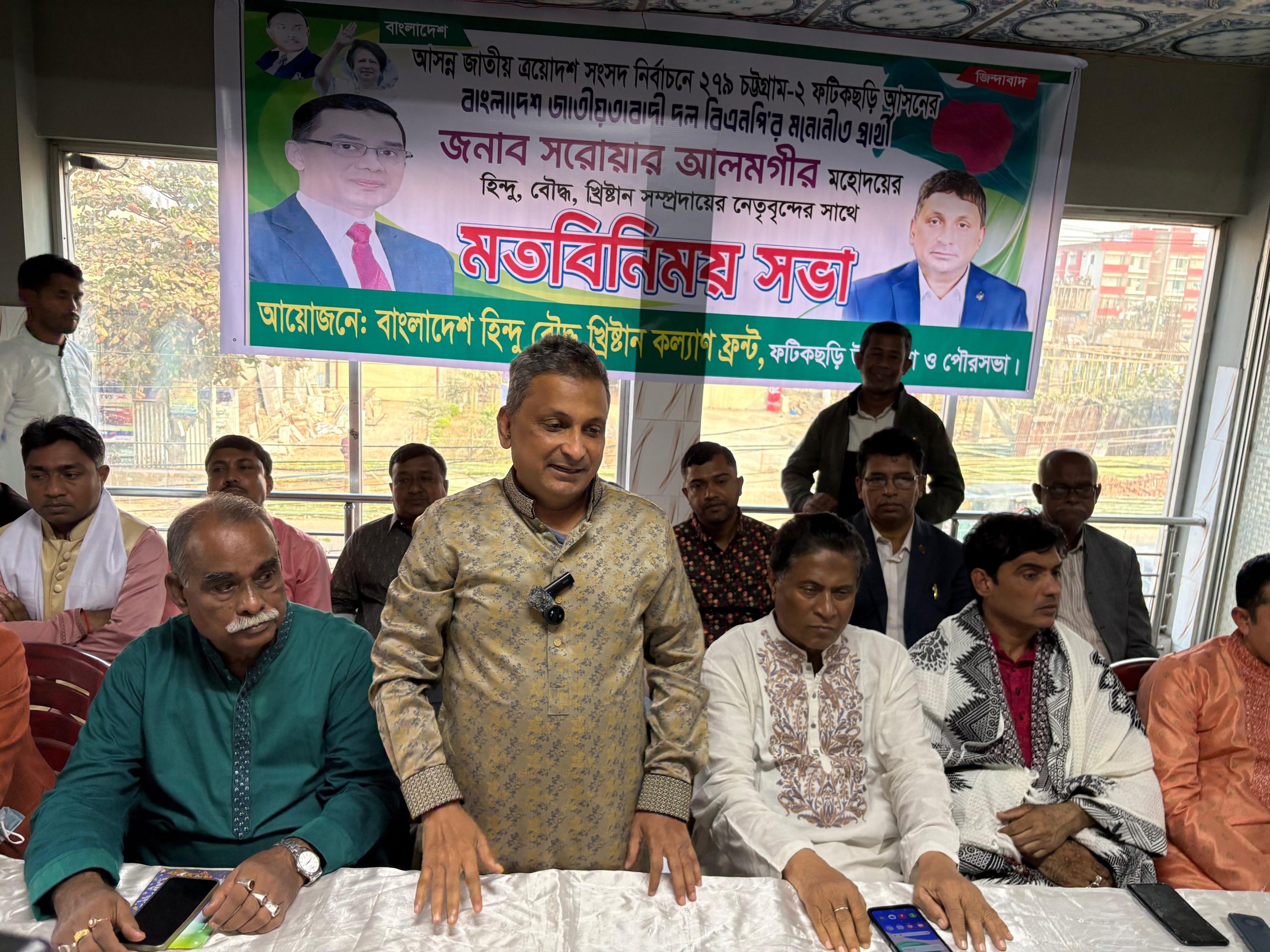 আজ শুক্রবার বিকেলে ফটিকছড়িতে হিন্দু বৌদ্ধ খ্রিস্টান ও আদিবাসী সম্প্রদায়ের প্রতিনিধিদের সাথে মতবিনিময়ে এসব কথা বলেন চট্টগ্রাম ২ ফটিকছড়ি আসনে বিএনপি মনোনীত প্রার্থী সরোয়ার আলমগীর।