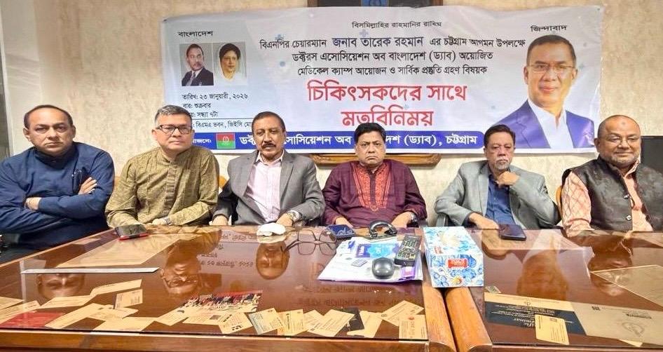 বিএনপির চেয়ারম্যান তারেক রহমানের চট্টগ্রামে আগমন এবং ঐতিহাসিক পলোগ্রাউন্ড ময়দানে ২৫ জানুয়ারি আয়োজিত মহাসমাবেশে আগত জনসাধারণের মাঝে চিকিৎসাসেবা প্রদানের লক্ষ্যে ডক্টরস এসোসিয়েশন অব বাংলাদেশ (ড্যাব) পরিচালিত মেডিকেল ক‍্যাম্প আয়োজন ও সার্বিক প্রস্তুতি গ্রহণ বিষয়ক চিকিৎসকদের সাথে মতবিনিময় সভা অনুষ্ঠিত হয়েছে।