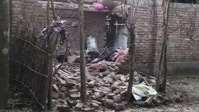 বিস্ফোরণে বাড়ির ইটের দেওয়াল ধসে গেছে। টিনের চাল উড়ে গেছে।