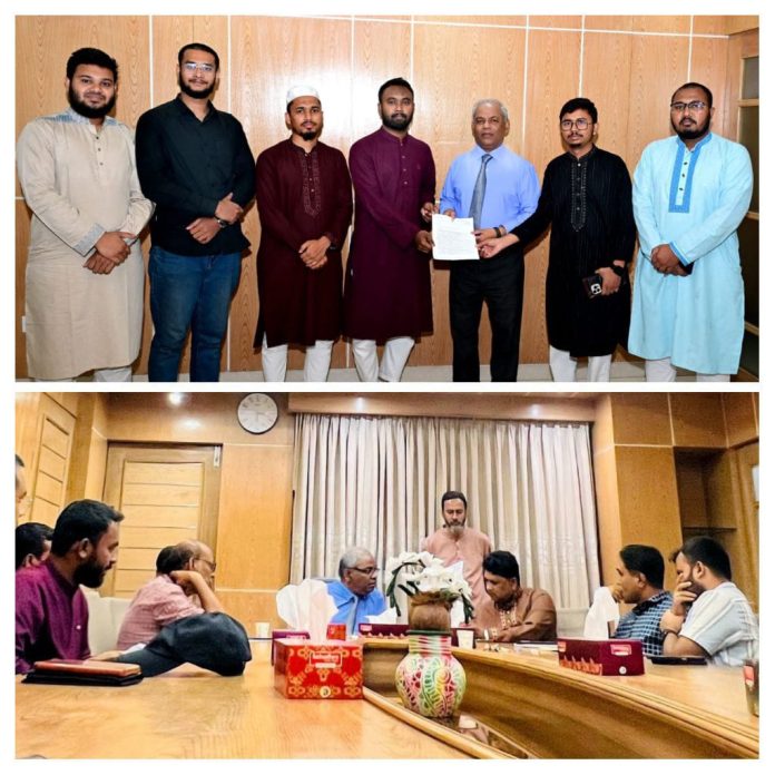 চট্টগ্রাম বিশ্ববিদ্যালয়ের মাননীয় উপাচার্য প্রফেসর ড. মোহাম্মদ আল্-ফোরকান এর সঙ্গে আজ বৃহস্পতিবার (২ এপ্রিল ২০২৬) সন্ধ্যা ৬টায় উপাচার্য দপ্তরে শাটল ট্রেনের বিভিন্ন সমস্যা সমাধানে জরুরি পদক্ষেপ এবং করণীয় সম্পর্কে মতবিনিময় করেছেন চট্টগ্রাম বিশ্ববিদ্যালয় কেন্দ্রীয় ছাত্র সংসদ (চাকসু)।