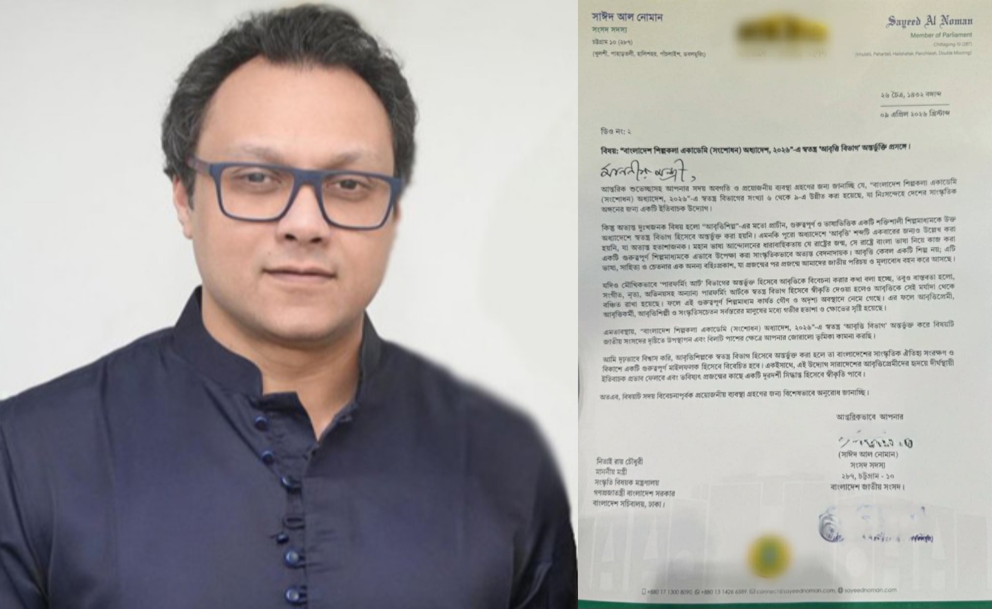 নিজস্ব প্রতিবেদক: বাংলাদেশ শিল্পকলা একাডেমি (সংশোধন) অধ্যাদেশ, ২০২৫–এ আবৃত্তিকে স্বতন্ত্র বিভাগ হিসেবে অন্তর্ভুক্ত করার জোর দাবি জানিয়েছেন সংসদ সদস্য সাঈদ আল নোমান। এ বিষয়ে সংস্কৃতি বিষয়ক মন্ত্রীর কাছে একটি ডিও (ডেমি-অফিসিয়াল) চিঠি দিয়েছেন তিনি।