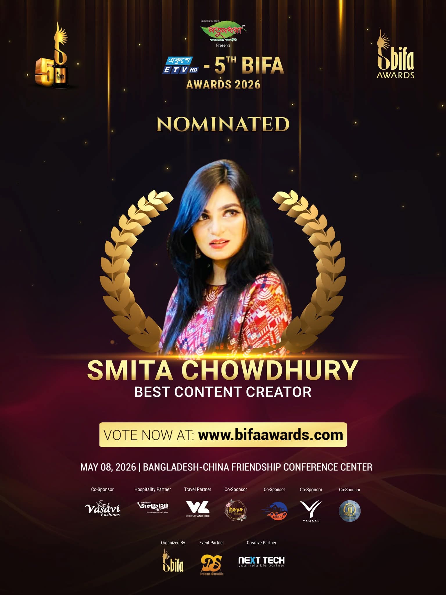 দেশের বিনোদন অঙ্গনের অন্যতম মর্যাদাপূর্ণ সম্মাননা ‘বাইফা অ্যাওয়ার্ড’-এ (বাংলাদেশ ইনস্টিটিউট অব ফিল্ম অ্যান্ড আর্টস) সেরা কনটেন্ট নির্মাতা বিভাগে মনোনয়ন পেয়েছেন চট্টগ্রামের মেয়ে, জনপ্রিয় উপস্থাপক ও কনটেন্ট নির্মাতা ।নয়ন তালিকা প্রকাশের পর থেকেই সামাজিক যোগাযোগমাধ্যম ও মিডিয়া অঙ্গনে প্রশংসায় ভাসছেন তিনি। ইতিমধ্যে এই অ্যাওয়ার্ডের জন্য ভোটিং কার্যক্রম শুরু হয়েছে।