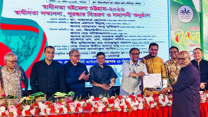 শনিবার (১৮ এপ্রিল) বিকেলে নগরীর চট্টগ্রাম জেলা স্টেডিয়ামের জিমনেসিয়াম চত্বরে চট্টগ্রাম সিটি করপোরেশনের উদ্যোগে আয়োজিত “স্বাধীনতা বইমেলা চট্টগ্রাম–২০২৬” এর সমাপনী দিনে স্বাধীনতা পদক–২০২৬ ও সাহিত্য সম্মাননা পদক–২০২৬ প্রদান অনুষ্ঠানে প্রধান অতিথির বক্তব্যে এসব কথা বলেন।