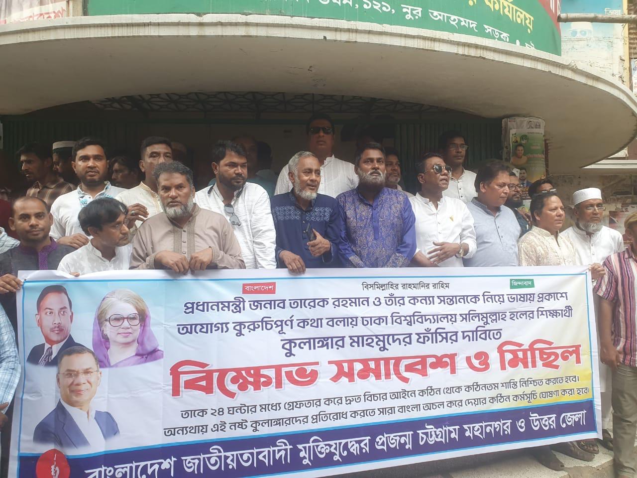 বিএনপির চেয়ারম্যান তারেক রহমান ও তাঁর কন্যা জাইমা রহমানকে নিয়ে কুরুচিপূর্ণ কটুক্তির প্রতিবাদে উত্তাল হয়ে উঠেছে চট্টগ্রাম। এই ঘটনার প্রতিবাদে এবং অভিযুক্ত মাহমুদকে দ্রুত গ্রেফতার ও দৃষ্টান্তমূলক শাস্তির দাবিতে নগরীতে বিশাল বিক্ষোভ মিছিল ও সমাবেশ করেছে জাতীয়তাবাদী মুক্তিযুদ্ধের প্রজন্ম চট্টগ্রাম মহানগর ও উত্তর জেলা শাখা।