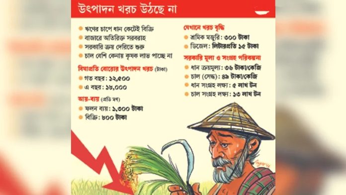 কৃষি মন্ত্রণালয় গত বছর (২০২৫ সাল) এক কেজি ধানের উৎপাদন খরচ হিসাব করেছিল ৩২ টাকা ৯৬ পয়সা। তাতে এক মণ (৪০ কেজি হিসাবে) ধানের খরচ দাঁড়ায় এক হাজার ৩১৮ টাকা। এবারও তারা খাদ্য মন্ত্রণালয়কে ধানের উৎপাদন খরচের একই রকম হিসাব দিয়েছে। সে অনুযায়ী সরকার চলতি বোরো মৌসুমে ধান-চাল সংগ্রহের মূল্য প্রতি কেজি ৩৬ টাকা নির্ধারণ করে। যদিও সার ও সেচে কৃষককে এ মৌসুমে বাড়তি ব্যয় করতে হয়েছে। তবে কৃষক সরকার নির্ধারিত মূল্যেও ধান বিক্রি করতে পারছেন না। ফলে মৌসুমের শুরুতেই বড় লোকসানের মুখে পড়ছেন কৃষক।
